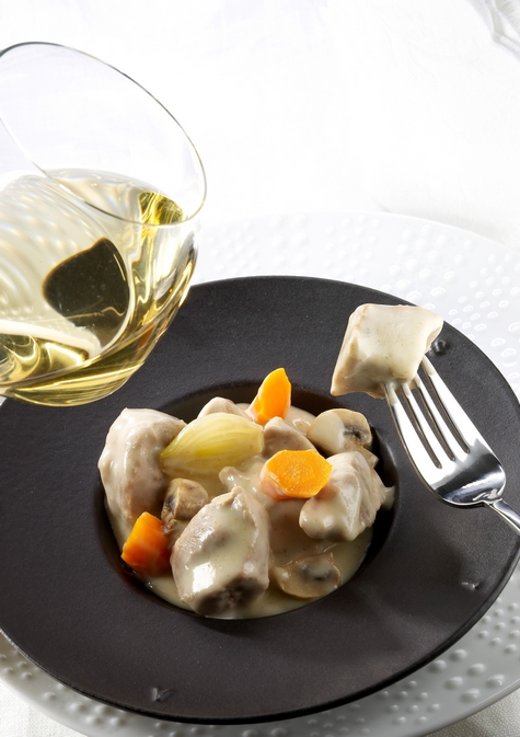Wegen ihrer zarten und weichen Textur und ihrer cremigen Saucen passen auch weißes Fleisch und Geflügel sehr gut. Der Wein frischt die Geschmeidigkeit der Sauce auf und gibt den Gerichten Volumen und Gleichgewicht. Dies ist zum Beispiel bei Kalbsfrikassee der Fall.